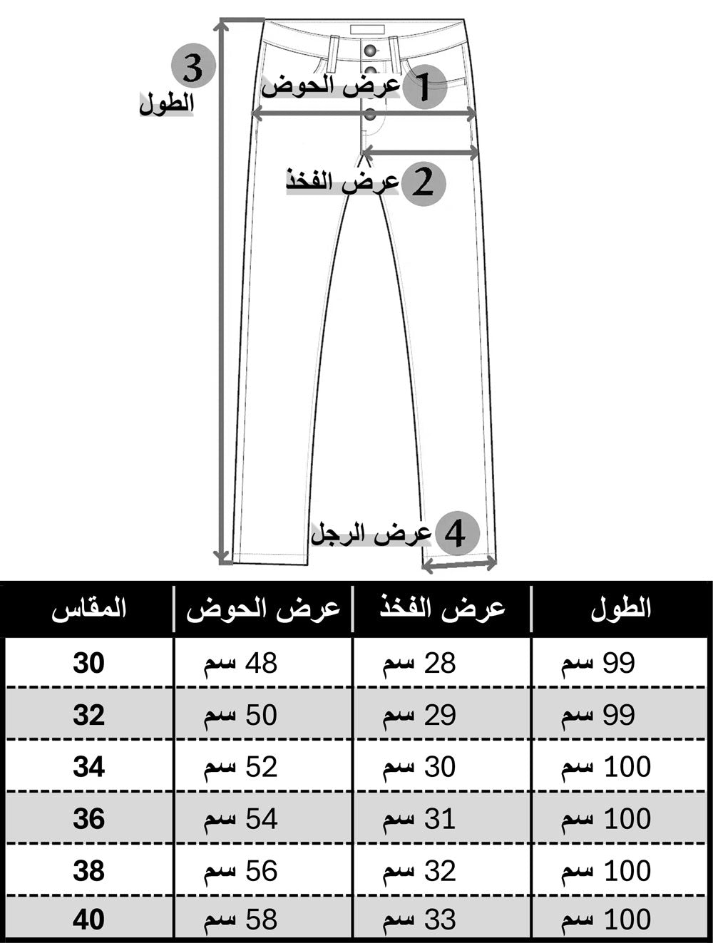 جدول المقاسات